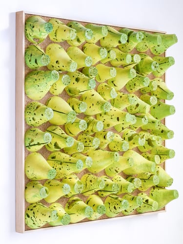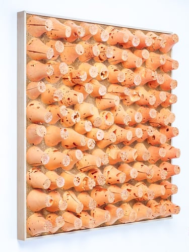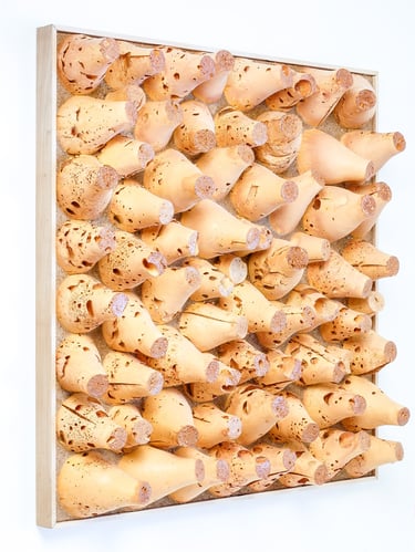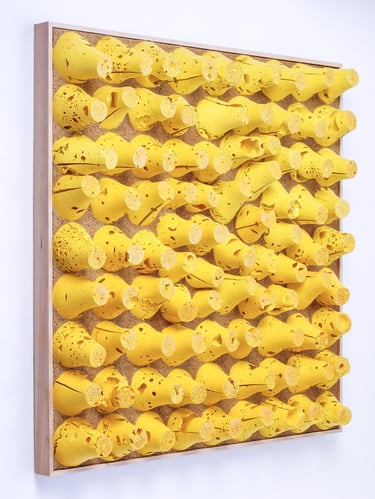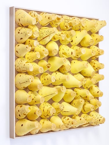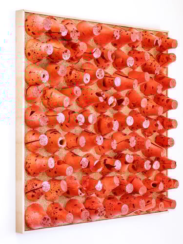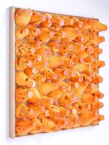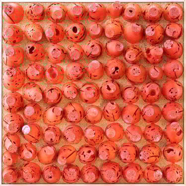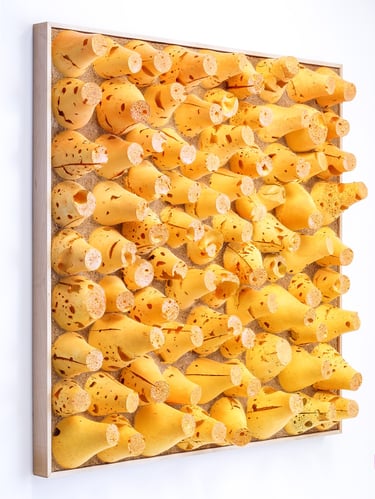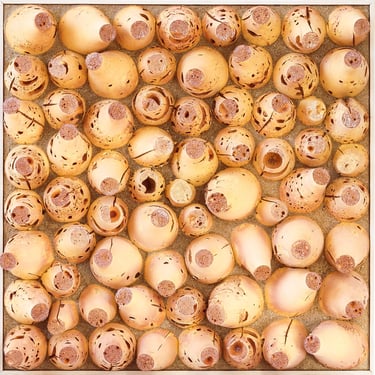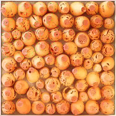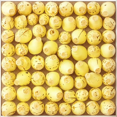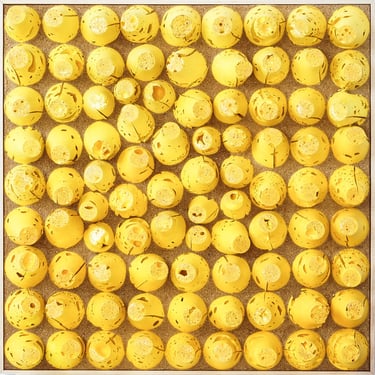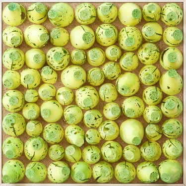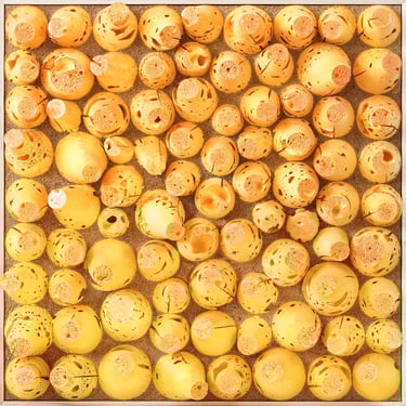 Acrylic, solid polyurethane, sawdust, resin on MDF panel. Natural maple frames.